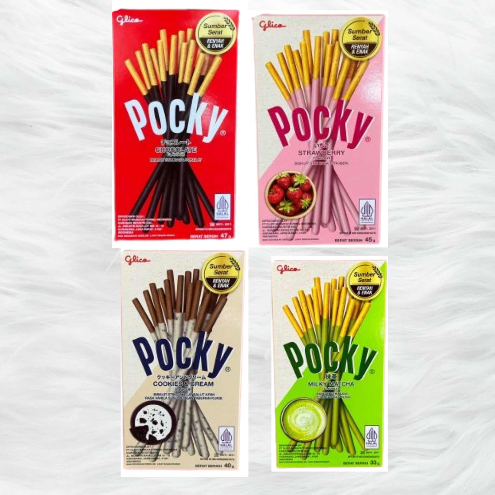Chocolate 47g, Strawberry 45g, Cookies & Cream 40g, Milky Matcha 33g